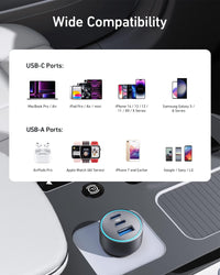 Simultaneous Charging: Charge up to three devices at once with a total output of 67W using the two USB-C ports and one USB-A port. When all three devices are connected, the USB-C 1 port delivers 45W of power through PPS / PD charging. High-Speed USB-C Charging: A 67W PowerIQ 3.0 USB-C port provides full-speed charging to USB-C laptops including the MacBook Pro 14". Ultra-Compact: The small and compact car charger, measuring just 2.3 × 1.2 × 1.2 inches, makes it the perfect travel companion for non-stop power on the road. ActiveShield 2.0 Safety System: Provides continuous temperature monitoring and output control to protect your connected device, so you can rest easy while driving. What You Get: Anker 535 Car Charger (67W), 3.2 ft (97.53 cm) USB-C to USB-C cable, welcome guide, our worry-free 18-month warranty, and friendly customer service.