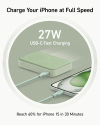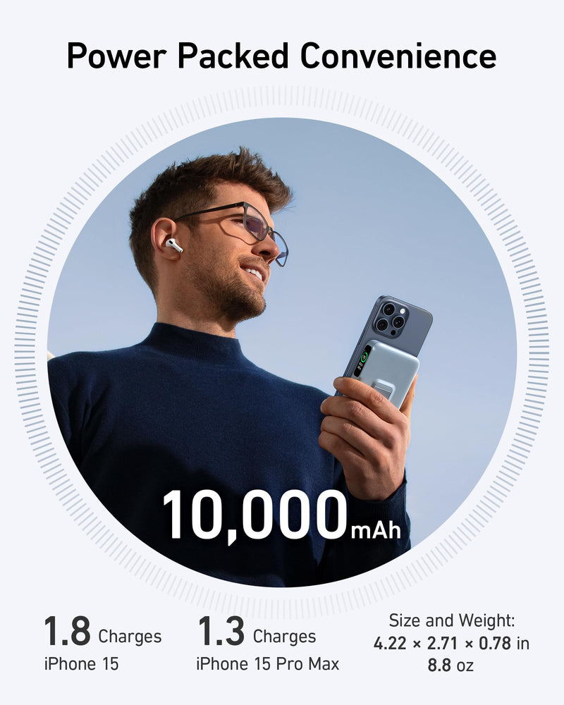 Qi2 Certified Charging: Embrace the convenience of 15W wireless charging that comes with the assurance of Qi2 certification for fast, secure, and efficient power boosts. Double Up on Speed: Enjoy 15W ultra-fast wireless charging and power up your devices 2X faster*. Get your iPhone 15 from 0 to 50% in just 44 minutes. Informative Smart Display: Keep tabs on your device's charging journey. From battery percentages to full recharge times, the intuitive smart screen ensures you're always updated. Power Up and Prop Up: With a powerful 10,000mAh, secure 1.8 charges for your iPhone 15 Pro and enjoy hands-free viewing with the built-in stand. What You Get: Anker MagGo Power Bank (10K), 2 ft (0.6 m) USB-C to USB-C cable, welcome guide, 24-month warranty, and our friendly customer service.