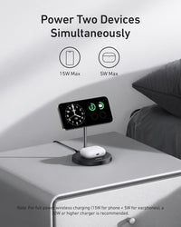 Fast, Efficient 15W Charging: Charge your iPhone 15 Pro up to 25% in just 21 minutes with this MagSafe-compatible 15W fast charger. Charge 2 Devices at Once: Enjoy the convenience and time-saving benefits of charging both your phone and earbuds at once. Find Your Perfect Charging Angle: Adjust your charging angle freely, thanks to the 45° vertical and 360° horizontal rotation capabilities. Stay Informed with Dual LEDs: Features two LED lights that distinctly indicate the charging status of your phone and earbuds—no more guessing! What You Get: Anker MagGo Wireless Charger (2-in-1 Stand), 40W adapter, 5 ft / 1.5 m USB-C to USB-C cable, welcome guide, 24-month warranty, and our friendly customer service.