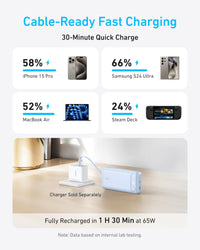 - Speedy Cable Charging: Utilize the built-in cable to elevate your iPhone 15 Pro to 58% or a MacBook Air to 52% in 30 minutes. You can also fully recharge this power bank in 1.5 hours with a 65W charger.