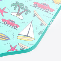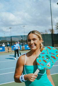 Catch the Cali vibes! The "CALIFORNIA" paddle is here to bring sunshine and surf to your game. With its fresh mint green and playful designs of surfboards, convertibles, and palm trees, this paddle is all about that laid-back, beachy cool. Hit the court and show them what California dreams are made of!
