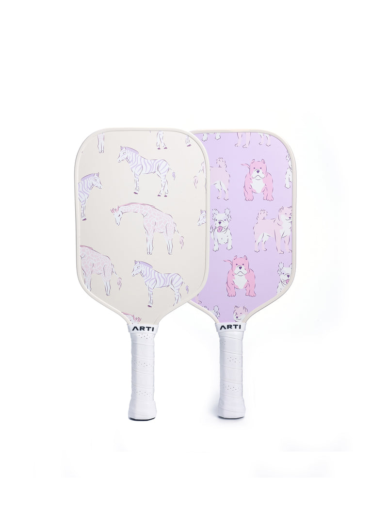 Introducing a high-performance pickleball paddle set. Equipped with 2 paddles, 4 balls and a your very own carry bag! This set is the perfect way to dazzle the court and get pickling! PADDLE SPECS: USAPA Approved Weight Range: 7.8-8.0 oz Length: 16.5“ Width: 8” Thickness: 16mm Handle Length: 5" Face: Fiberglass Core: Honeycomb Polymer Core WHY YOU"LL FALL IN LOVE? Top-of-the-line design and quality Lightweight yet powerful Optimized for spin and control Design Story Get ready to play in style with the ARTI Animal Series Paddle Set – where cute meets cool on the court! These paddles are all about personality, featuring laid-back leopards and chill zebras in soft pastel tones. With a matching ARTI bag and bright pickleballs, this set has everything you need to bring a pop of playful energy to your game. Perfect for players who love a little wild flair – grab your Animal Series paddles and let the fun be
