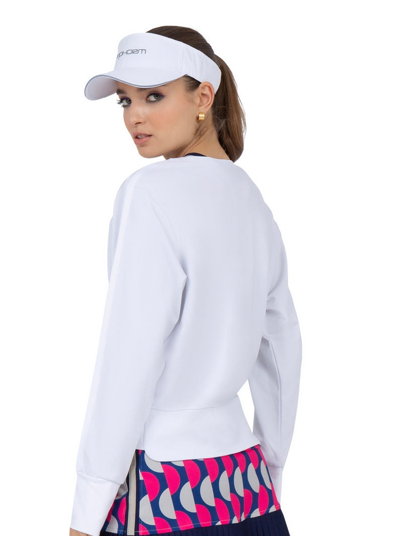 Gear up for your next pickleball match or elevate your everyday look with the Camila Performance Sweatshirt. This relaxed-fit sweatshirt boasts a UPF 50+ rating, providing exceptional protection against harmful ultraviolet rays, whether you're crushing aces on the court or lounging around in style.Relaxed fit for optimal comfort UPF 50+ rating for sun protection Four-way stretch for unrestricted movement Soft, luxurious performance fabric Eye-catching pickleball racket print Machine washable and easy care Sustainable blend of recycled materials - 67% recycled rayon, 28% nylon, and 5% spandex. This blend offers the perfect combination of softness, breathability, and long-lasting durability.
