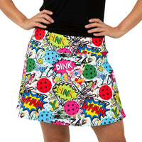 Introducing Queen of the Court Dink Dink Wham Pickleball and Tennis Skirt. Crafted from lightweight, breathable poly-spandex fabric, our designs feature a wide elastic waistband, moisture-wicking black shorts, and flat seams. MADE IN USA PERFORMANCE ACTIVE WEAR: Lightweight, breathable poly-spandex fabric. FUNCTIONAL DESIGN: Wide elastic waistband smooths tummy, stays in place. BUILT-IN STAY DOWN SHORTS: 5” Inseam, wicks moisture away for all-day comfort. COMFORTABLE FLAT SEAMS: Reduce chafing while exercising. PERFECT FIT: Sizes ranging from XXS (US 0-2) to XXL (US 18-20)