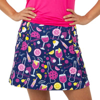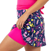 Introducing Queen of the Court Dinks and Drinks 15” Pickleball Skirt with side pockets. Perfect for holding your phone, a ball or anything else. Crafted from lightweight, breathable poly-spandex fabric, our designs feature a wide elastic waistband, moisture-wicking pink shorts, and flat seams. MADE IN USA PERFORMANCE ACTIVE WEAR: Lightweight, breathable poly-spandex fabric. FUNCTIONAL DESIGN: Wide elastic waistband smooths tummy, stays in place. BUILT-IN STAY DOWN SHORTS: 6" Inseam, wicks moisture away for all-day comfort. COMFORTABLE FLAT SEAMS: Reduce chafing while exercising. PERFECT FIT: Sizes ranging from XS (US 0-2) to XXL (US 18-20)