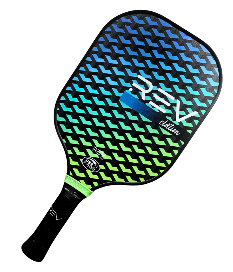 The Elation Paddle is designed for players who want to elevate their game with a perfect balance of power and control. Whether you're moving from beginner to intermediate or are already a seasoned player, the Elation paddle will help you enhance your performance with every shot. Key Features & Why They Matter Fiberglass Face: The fiberglass face provides extra durability and gives you more power and control on every hit. This means you’ll be able to make your shots more powerful, while still maintaining good precision. 13mm Polypropylene Honeycomb Core: The core is the heart of the paddle. The 13mm thickness offers a balance between strength and control, giving you powerful drives and volleys without losing touch. It's perfect for hitting hard shots while keeping them accurate. Comfortable Grip: The handle is designed for comfort, reducing strain on your hand and wrist during extended play. A better grip leads to better control and more comfortable swings. Tournament-Ready: USAPA approved for tournament play, meaning this paddle meets the standards needed for competitive play. Specifications Paddle Dimensions: 16" x 8" Face Material: Fiberglass Core Thickness: 13mm polypropylene honeycomb core Handle Length: 5" Grip Circumference: 4.25" Weight: Approximately 8.0 oz Special Features: USAPA approved for tournament play, honeycomb core for power and control Why Choose the Elation Paddle? The Elation Paddle is built for players who want to increase their power without sacrificing control. Its high-quality materials, including the fiberglass face and honeycomb core, are designed to enhance your game with a blend of strength and precision. Perfect for players who want to add more power to their shots while still staying in control of the ball. How is the Elation Different from Other Rev Paddles? Compared to the Aria Paddle: The Elation is designed for players looking for more power on their shots, thanks to the 13mm core, while the Aria focuses on extra reach and a lightweight design. Compared to the Platinum Paddle: The Platinum is more geared toward speed and quick handling with its edgeless design and aerodynamic features, while the Elation provides a stronger core for consistent power and control. Purpose-Built for Power and Control The Elation Paddle is for players who are looking to elevate their game with a pro-level paddle that balances both strength and precision. Whether you’re advancing through the levels or competing at a high level, the Elation gives you the tools to perform your best on the court.