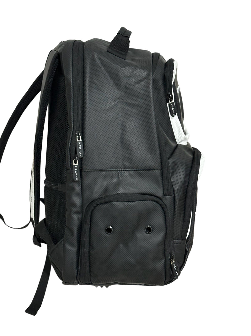Thrive Elite Backpack is made of 100% vegan leather and designed for the player who prefers using a smaller backpack then our Tour Bag. This backpack still maintains a stylish and sleek look while having all the functionality of would expect. This backpack has a padded compartment to hold your paddles as well as another large compartment to hold all your other necessary items. There is also a zippered shoe compartment and two zippered front pockets. All zippers on this bag have a custom THRIVE logo to add to the look of the backpack.