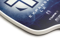 Thickness: 16 mm Length: 15.88" Width: 8.13" Handle length: 5" Indigo Ice limited edition. The Expanse LX is for the player who wants extra control and defense at the net with a balance of control and power. Made with the TMPR Luxe Core. It has a 5" handle length, and comes standard with a 4.25" circumference that is octagonally-shaped. The Expanse LX is TMPR's version of a wide-body paddle, with slightly rounded sides to increase both playing area and performance. Features TMPR vibration dampening technology.