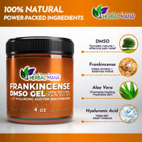 What’s Holding You Back? Are chronic pain, inflammation, or stress disrupting your day-to-day life? Whether it’s stiff joints, aching muscles, or the weight of stress pulling you down, these challenges can keep you from fully enjoying life’s most precious moments. It’s time to reclaim control and find fast relief with Frankincense DMSO Gel—a powerful, natural solution designed to ease discomfort and support your overall wellness. Why Frankincense DMSO Gel is the Solution Don’t let chronic pain and stress define your life. Our Frankincense DMSO Gel is expertly crafted to provide quick relief from inflammation, pain, and tension. It’s more than just a gel—it’s a natural remedy that harnesses the power of carefully chosen ingredients to offer holistic support for both body and mind. From arthritis relief to skin health, each ingredient works to deliver real, noticeable results. Here’s why Frankincense DMSO Gel stands out: DMSO: A fast-acting agent known for its deep absorption and anti-inflammatory properties. DMSO targets pain at its source, reducing swelling and promoting healing, making it ideal for joint pain, arthritis, and sore muscles. Plus, it enhances the effectiveness of the other ingredients for quicker relief. Frankincense: This therapeutic-grade essential oil is revered for its ability to calm the mind, boost immune function, and reduce inflammation. Its soothing scent relieves stress, promotes restful sleep, and supports healthy skin. Hyaluronic Acid: Key to joint health, hyaluronic acid acts as a natural lubricant, reducing friction and easing pain. It improves joint flexibility and smooth movement, especially helpful for those with arthritis or joint stiffness. Aloe Vera: Known for its soothing and healing properties, aloe vera hydrates the skin, reduces irritation, and promotes healing. It’s perfect for calming sunburns, reducing inflammation, and maintaining skin health. How It Works—And How You’ll Benefit Fast-Acting, Deep-Absorbing FormulaSimply apply Frankincense DMSO Gel directly to the affected area. The DMSO penetrates quickly, delivering relief straight to the source of pain and inflammation. Its fast-absorbing formula means you won’t be left feeling greasy or sticky—just fast relief and comfort. Immediate and Long-Lasting ReliefExperience relief within minutes that lasts throughout the day. Whether it’s joint pain, arthritis, or muscle soreness, this gel works to reduce inflammation and ease discomfort, so you can get back to what matters most. Joint Support and Skin Health in OneThe combination of hyaluronic acid and aloe vera offers dual benefits: support for healthy, pain-free joints and hydration for glowing, nourished skin. You’ll not only feel better but look refreshed, too. Natural Stress Relief and Calming EffectFrankincense isn’t just about pain relief—it also reduces stress and balances mood. The calming aroma helps promote relaxation, making it a great addition to your evening routine for restful, rejuvenating sleep. Experience Frankincense DMSO Gel Today Stop letting pain, stress, and inflammation control your life. Frankincense DMSO Gel is a fast-acting, all-natural solution designed to help you move freely, feel better, and live your life without discomfort or worry. Your body deserves relief. Your peace of mind deserves this.Try Frankincense DMSO Gel today and discover the difference it can make in your daily life. Order Now and Feel the Difference Fast, free shipping on orders $75+ 30-Day satisfaction guarantee Made with 100% sustainably sourced, cruelty-free ingredients Directions Clean the area you'd like to apply Frankincense DMSO gel with soap and water. Apply the Frankincense DMSO gel daily and as needed for pain. Wash hands & application site before use. For topical use only. Slight skin irritation may occur, but is temporary and lessens as your skin gets used to the gel. If irritation persists, rinse with warm water. Ingredients DMSO (99.995% Pharmaceutical Grade), Organic Aloe Vera Juice, Frankincense Essential Oil (Boswellia Carterii, Frereana, Sacra), Hydrated Silica (USP Grade), Hyaluronic Acid (Non-GMO) Essential Oil Benefits Infused with Pure Therapeutic Grade Essential Oils Frankincense: Helps relieve stress, boost the immune system, reduce pain and inflammation, supports healthy cellular function, and helps balance mood. Disclaimers *The statements made regarding these products have not been evaluated by the Food and Drug Administration. The efficacy of these products has not been confirmed by FDA-approved research. These products are not intended to diagnose, treat, cure or prevent any disease. All information presented here is not meant as a substitute for or alternative to information from health care practitioners. Please consult your health care professional about potential interactions or other possible complications before using any product. The Federal Food, Drug and Cosmetic Act requires this notice. The individuals providing testimonials on this site experienced extraordinary results while using these products. As individuals differ, so will results. They were not paid for their testimonies.