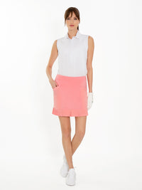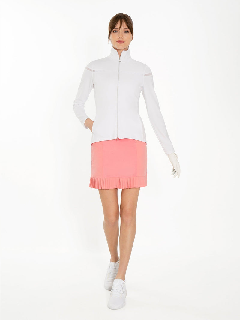 Classic style with modern performance. This skirt is designed for golf. It features hidden elastic waistband, built-in compression short and our signature knife pleat hem. Two front pockets for tennis ball, tee pins or personal items. Easy care fabric that dries fast and has quick recovery from wrinkles and protects your body from the harmful UV rays without the harmful chemicals. FittedUPF 50+Four-way stretchMoisture wicking and quick drySkirt - 88% Polyester, 12% SpandexShort Liner- 88% Recycled Polyster, 12% SpandexTwo front pocketsEasy careMachine washableSkirt length 17"