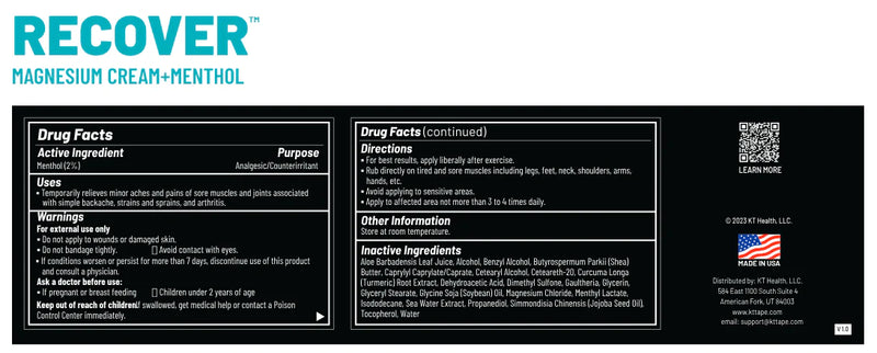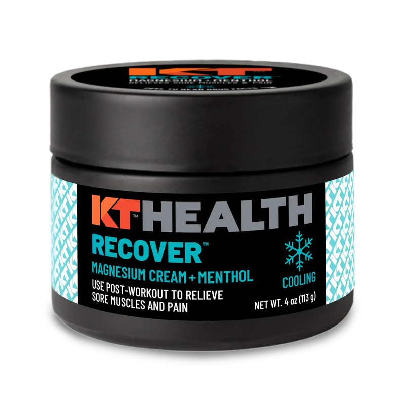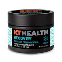 - KT Health Recover™: After an intense workout, turn to our Recover™ variant, made with Menthol (2%) for light cooling. Designed for post-workout use, it provides light cooling relief to soothe sore muscles and reduce discomfort. It’s the perfect recovering magnesium cream for athletes looking to speed up recovery and prevent lingering tightness or muscle cramps.