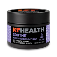 Unlock Your Best Performance and enhance muscle recovery with KT Health Magnesium Creams – the ultimate solution for pre- and post-workout muscle care, relief and calming recovery. Designed for athletes and active individuals, our innovative creams provide targeted support for sore muscles, joint relief, and overall muscle wellness. Our innovative creams come in three powerful variants to support you every step of the way: KT Health Activate™, KT Health Recover™ and KT Health Soothe™. Nourish and Support Your Body KT Health Magnesium Creams go beyond basic muscle care by offering deep muscle relaxation while being gentle on the skin. Infused with nourishing ingredients like Jojoba Oil, Aloe, and Shea Butter, our cream has a smooth, lotion-like consistency that absorbs quickly without leaving a greasy residue. Whether you need muscle relief cream to prepare for a tough session, recover from a strenuous workout, or simply unwind, our magnesium-infused formula has you covered. Product Variants for Every Stage of Your Routine: KT Health Activate™: Prepare your muscles for action with our Activate™ variant, made with Arnica Montana. This activating magnesium cream helps loosen muscles and reduce stiffness, giving you the flexibility and mobility needed to perform at your best. Ideal for athletes, weightlifters, and runners, KT Health Activate™ ensures your body is primed for peak performance. KT Health Recover™: After an intense workout, turn to our Recover™ variant, made with Menthol (2%) for light cooling. Designed for post-workout use, it provides light cooling relief to soothe sore muscles and reduce discomfort. It’s the perfect recovering magnesium cream for athletes looking to speed up recovery and prevent lingering tightness or muscle cramps. KT Health Soothe™: When your body and mind need relaxation, KT Health Soothe™ provides deep muscle rub relaxation with the aromatherapeutic benefits of Lavender and Arnica. Designed to soothe sore muscles while helping you unwind. Perfect for use before bed or after an intense workout, KT Health Soothe™ promotes muscle and joint relief while helping your body fully recover. Complete Muscle Support for Every Athlete Pre & Post Workout Support:Experience the full spectrum of benefits with KT Health Magnesium Creams. Whether you're gearing up for a workout or winding down afterward, our creams are your go-to solution for muscle care. Calming Recovery: When you are looking for soothing and calming recovery, trust the NEW KT Health Soothe Magnesium Cream for the aromatherapy benefits of Lavender, plus Arnica and Magnesium together in an easy to use and soothing cream. KT Soothe is perfect for helping both your body and mind to relax and recover effectively. Ingredients for Healthy Skin: Not only do KT Health Magnesium Creams deliver the workout benefits of Active Magnesium, but they are designed to be great for your skin. Each 4oz jar contains Aloe, Shea Butter, and Jojoba Oil to support healthy skin. Benefits Include: Warmup & Loosen Muscles: Activate your muscles and get ready to perform at your best with our pre-workout cream. Don't let muscle stiffness hold you back, KT Health Magnesium Creams are built to help you overcome and stick to your goals Cooldown & Recover: Relieve tired muscles and relieve soreness as part of your recovery post-workout with our cooling cream. Soothing and Calming: Full recovery means more than just taking care of your muscles, calming your mind AND body together help support your complete recovery and preparation for tomorrow. Trust KT Health Soothe when looking for relaxation and calming benefits. Workout Support System: Enhance your workout routine with our comprehensive support system, ensuring you're able to perform at your peak and help manage stiffness and soreness. Effective Relief: Alleviate minor aches and pains in muscles and joints, including strains, soreness, and discomfort associated with workouts. Powerful Blend of Ingredients: Our unique blend of ingredients is specially formulated to provide warming/cooling and penetrating pain relief, making it the ideal choice for proactive muscle care. Pre-hab Practice: Incorporate our creams into your pre-hab routine to proactively manage your soreness or stiffness and perform at your best. Temporary Muscle Pain Relief: Effectively reduces aches and pains in muscles. Reduces Swelling and Inflammation: Helps alleviate discomfort associated with inflammation. Aromatherapy Benefits: Lavender provides a calming and relaxing scent. Mental Relaxation: Promotes a sense of tranquility and reduces stress. Improved Recovery: Supports overall recovery by addressing both physical and mental well-being. Natural Ingredients: Formulated with Lavender and Arnica, known for their soothing properties. Enhanced Sleep Preparation: Aids in preparing the body and mind for restful sleep. Skin Nourishing: Includes ingredients that are good for the skin. Easy Topical Application: The cream's consistency allows for smooth and easy application. Holistic Recovery: Provides a holistic approach to recovery, addressing both body and mind. For best results, incorporate both KT Health Activate™ and KT Health Recover™ Magnesium Creams into your workout regimen, and rely on KT Health Soothe™ for calming benefits. Whether you're preparing for a marathon or recovering from exertion, our magnesium creams have you covered. Experience the KT Health Difference:Join countless athletes who trust KT Health Magnesium Creams to support their active lifestyles and workout goals. With our advanced magnesium cream muscle recovery formulas and targeted relief, you can push your limits and achieve your fitness goals with confidence. Each jar contains 4.0 fl oz of KT Magnesium Cream.