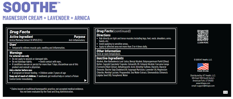 - KT Health Soothe™: When your body and mind need relaxation, KT Health Soothe™ provides deep muscle rub relaxation with the aromatherapeutic benefits of Lavender and Arnica. Designed to soothe sore muscles while helping you unwind. Perfect for use before bed or after an intense workout, KT Health Soothe™ promotes muscle and joint relief while helping your body fully recover.