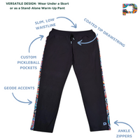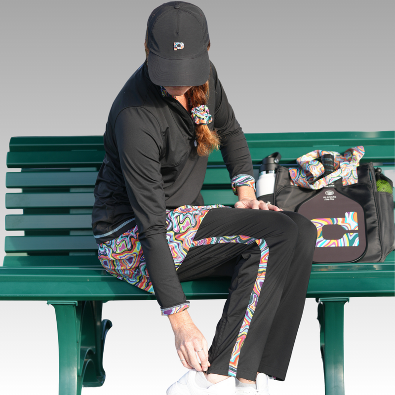 The Lexi Pant was designed to fit comfortably under your pickleball skort. Made with our signature SwiftForm™ fabric, they’re breathable, flexible, and ready for game time. The slim, low waistline won’t add bulk, but the drawstring and elastic ensure they stay put while you move. Generous ankle zippers allow you to slip off the pants without removing your shoes. Black pant with colorful geode side-stripe accents Playly pickleball pockets set back and out of the way for convenient ball storage Drawcord accented with coated tips featuring the Playly logo Sizes: XS, S, M, L, XL
