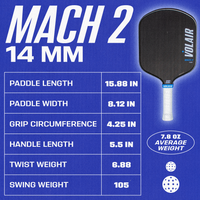 Money Back Guarantee Shop confidently with a Money Back Guarantee on Paddles. View here. Experience the control of a Volair paddle now in a wide body. With the Volair Mach 2, you gain an extra edge on the court, thanks to its wider design. Say goodbye to those frustrating mishits and hello to a new level of confidence. When purchased directly from volair.com this paddle comes with a neoprene head cover. View our paddle comparison chart here! Fast shipping options available at checkout. Volair Widebody PaddleDesign PatentPatent No. D1,060,555.