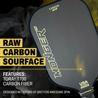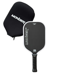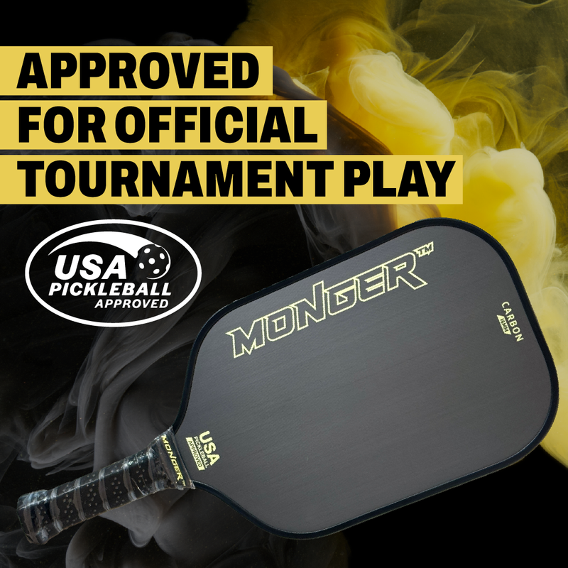 Experience the power, precision and spin with the Monger Carbon Power Paddle constructed with T700 Carbon Fiber and an elongated 5.7” handle for those two handed back hand shots at 16mm, a masterpiece of pickleball engineering. Crafted with a relentless focus on performance and durability, its Toray T700 carbon-fiber surface grips the ball for unreal spin, while the robust polymer core delivers explosive power and ultimate control. The seamless unibody construction ensures enduring stability and a formidable sweet spot that makes every shot count. Take control of your game with the Monger paddle—where consistency meets exceptional play. Turn Random Shots into Winning Streaks: Say farewell to inconsistent play with the Pickleball Monger paddle's precision honeycomb polymer core and T700 carbon fiber surface, ensuring precise control that turns every dink and drive into a deliberate, winning shot. Combat Discomfort with Cushioned Control: The Monger’s 5-inch handle and PU leather factory grip provides a premium comfortable hold, increasing shock absorption and reducing fatigue for those epic matches and extended tournaments. Experience Spin Mastery with Textured Surface: Don’t just play; dominate with spin. The Monger paddle's raw Toray T700 carbon fiber surface amplifies your ability to execute unreal high-spin shots, confusing opponents and enhancing your shot-making arsenal. Count on Consistency with Unibody Construction: Experience unmatched performance with the Monger's one-piece construction seamlessly uniting the paddle face with the handle for enhanced stability and a reassuring durability that keeps your game consistent, shot after shot. Maximize Reach without Sacrificing Speed: The Monger paddle, approved for official tournament play, brings a balanced blend of lightweight design and extended reach. Its 16.5" length and protective edge band combine for agile strikes and long-lasting durability, ensuring that you outmaneuver opponents with ease while your paddle withstands the test of time. Step onto the court with confidence and command every game. Click the button below to grab your Monger paddle now and transform your pickleball experience. Don't wait—elevate your game today and be the force to be reckoned with at every match!