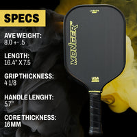 Experience the power, precision and spin with the Monger Carbon Power Paddle constructed with T700 Carbon Fiber and an elongated 5.7” handle for those two handed back hand shots at 16mm, a masterpiece of pickleball engineering.