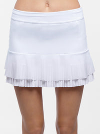 This super stylish performance pleated skirt has a soft mesh overlay flounce that gives it a subtle elegance and a feminine touch. Built in short with powermesh double function pocket to keep your tennis ball or belonging secured. Semi-fittedMoisture ManagementBuilt-in shorts with double function ball pocketPleated hem with mesh overlay founceUPF 50+Four-way stretch88% Recycled polyester, 12% spandexLength: 13.5"Machine Washable