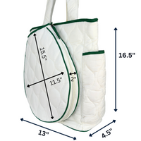 *****Please note White is last season style without slip pocket in back. SPACIOUS TENNIS BAG OR PADEL BAG: Keep your essentials organized with multiple compartments designed to accommodate your racquets, padels, apparel, accessories, and personal items effortlessly. 16.5” x 13” x 4.5”. CONVERTIBLE TENNIS OR PADEL BAG FOR WOMEN: Park Ave tennis and padel bags levels up your style. Use it for all of your racket sports. Accomodates two (2) standard size rackets or one (1) oversized racket or one (1) padel racket. Tennis/padel front pocket 15.5" x 11.5" x 2". HIGH QUALITY: High quality nylon exterior with fashionable puffer style design. Includes two (2) large exterior waterbottle or ball pockets. Gives easy access. Carry as a backpack or shoulder bag. Three interior pockets.