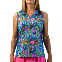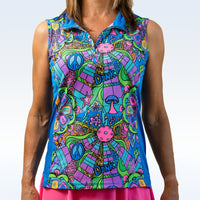 With icons from the 60’s and 70’s, along with pickleballs, paddles, courts and game lingo, the psychedelic colors will definitely have you feeling “Groovy” as you stroll down memory lane! Our sleeveless quarter-zip tops are the perfect essential for keeping cool, on or off the courts.