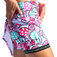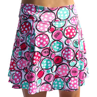 Our Dink 2 print lets everyone know your game! With pickleballs, circles and text stamped, “Dink” throughout the print, in shades of pinks, mint green, accented with black and white, this print remains a customer favorite. FEATURES ● Figure flattering A-line style, with classy flare, hip to hem ● Modest skirt length & short inseam, both increasing with size ● Comfortable, no roll, wide waistband ● Custom milled, lightweight 4-way stretch fabric ● Attached compression shorts ● Ball pocket & deep pocket on each side of shorts ● Tug free, no slip grip tape at leg openings ● Flat seam construction for no fuss wear SIZING NOTE: Skorts get longer as you increase in size. Each size up we increase the length by an inch.