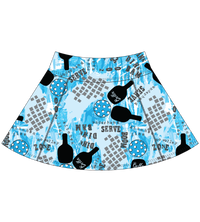 You’ll recognize all the pickleball lingo on our Graffiti 2 print! With a color palette of blues, light gray, black and white, the paddles, pickleballs and text all make for fun play! FEATURES ● Figure flattering A-line style, with classy flare, hip to hem ● Modest skirt length & short inseam, both increasing with size ● Comfortable, no roll, wide waistband ● Custom milled, lightweight 4-way stretch fabric ● Attached compression shorts ● Ball pocket & deep pocket on each side of shorts ● Tug free, no slip grip tape at leg openings ● Flat seam construction for no fuss wear SIZING NOTE: Skorts get longer as you increase in size. Each size up we increase the length by an inch.