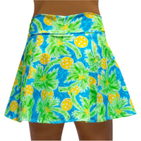 Sorry, your browser doesn't support embedded videos. Our Palms print was inspired by playing in coastal areas with swaying coconut palms, clear skies and pickleball suns! With a bright watercolor style color palette of shades of blue, green, yellow and white, it will have you on the bright side of life! FEATURES ● Figure flattering A-line style, with classy flare, hip to hem ● Modest skirt length & short inseam, both increasing with size ● Comfortable, no roll, wide waistband ● Custom milled, lightweight 4-way stretch fabric ● Attached compression shorts ● Ball pocket & deep pocket on each side of shorts ● Tug free, no slip grip tape at leg openings ● Flat seam construction for no fuss wear SIZING NOTE: Skorts get longer as you increase in size. Each size up we increase the length by an inch.