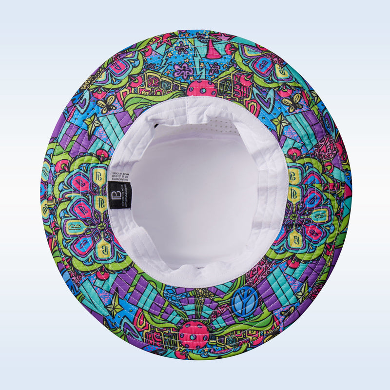 With our Groovy print on the brim underside, our bucket hat is perfect for on and off the courts. Featuring psychedelic colored icons from the 60’s and 70’s with a little pickleball thrown in, it will be your go to for shady sun protection. FEATURES Adjustable toggle drawstring Windproof Foldable Breathable, cooling mesh vents Washable Quick dry 100% polyester Lightweight & durable Shady brim for sun protection
