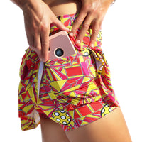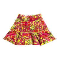 Our Angle Shot print brings to mind all those angles we strive to one day make on the courts! Featuring pickleballs, courts and angles of all sorts, in a bold fuchsia, yellow and red-orange color palette, with accents of black and white. FEATURES ● Figure flattering A-line style, with classy flare, hip to hem ● Modest skirt length & short inseam, both increasing with size ● Comfortable, no roll, wide waistband ● Custom milled, lightweight 4-way stretch fabric ● Attached compression shorts ● Ball pocket & deep pocket on each side of shorts ● Tug free, no slip grip tape at leg openings ● Flat seam construction for no fuss wear SIZING NOTE: Skorts get longer as you increase in size. Each size up we increase the length by an inch.