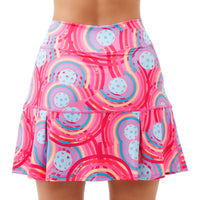 Our Circles print brings to mind all the head spinning we experience just trying to keep track of scores and serves! The bold shades of pinks, blue, gold and teal in the circle layers and blue pickleballs, this print will have you smiling! FEATURES ● Figure flattering style, with two sassy pleats in front & back ● Modest skirt length & short inseam, both increasing with size ● Comfortable, no roll wide waistband ● Custom milled, lightweight 4-way stretch fabric ● Ball pocket & deep pocket on each side of shorts ● Tug free, no slip grip tape at leg openings Flat seam construction for no fuss wear SIZING NOTE: Skorts get longer as you increase in size. Each size up we increase the length by an inch.