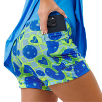 Bright electric blue skirt, combined with our Net worth print attached compression shorts. Our Net worth print has pickleballs and paddles bouncing atop a net design background in a bright, neon color palette of blues, greens and yellow. It’s a worthy combo!