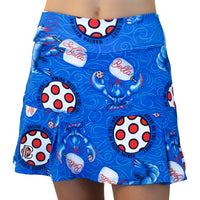 We all know a Lobster Monster who makes waves on the court, lobbing nearly every shot! This print is an ode to that love hate relationship! With paddles, pickleballs, waves and lobsters, all in a red, white and blue color palette, accented with black, this print is a real conversation starter! FEATURES ● Figure flattering style, with two sassy pleats in front & back ● Modest skirt length & short inseam, both increasing with size ● Comfortable, no roll, wide waistband ● Custom milled, lightweight 4-way stretch fabric ● Attached compression shorts ● Ball pocket & deep pocket on each side of shorts ● Tug free, no slip grip tape at leg openings Flat seam construction for no fuss wear SIZING NOTE: Skorts get longer as you increase in size. Each size up we increase the length by an inch.