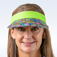 Our popular Groovy print with its icons and color palette from the 60’s and 70’s is featured on the top and underside of the hard bill. Our Visor is a great way to stay cool on those hot, sunny days FEATURES Elastic coil binding Stay put adjustable all size fit Moisture wicking headband Cool & comfortable Lightweight, quick dry materials Hard bill