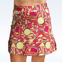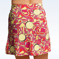 Our Angle Shot print brings to mind all the angles on the course we strive to one day master! Featuring golf balls, greens and angles of every kind, in a bold fuchsia, yellow and red-orange color palette, with accents of black and white. FEATURES Figure flattering straight skirt style, with side slits at hem Modest skirt length & short inseam, both increasing with size Comfortable, no roll waistband Custom milled, lightweight 4-way stretch fabric Attached compression shorts Pockets on each side & one pocket at back of skirt Tug free, no slip grip tape at leg openings Double tee holder Flat seam construction for no fuss wear * Coordinating top, zip-hoodie, and bucket hat are sold separately!