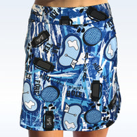 You’ll recognize all the golf terms on our Graffiti print! With a color palette of blues, light gray, black and white, the golf bags, golf clubs, golf balls and lingo all make for a fun tee time! FEATURES Figure flattering straight skirt style, with side slits at hem Modest skirt length & short inseam, both increasing with size Comfortable, no roll waistband Custom milled, lightweight 4-way stretch fabric Attached compression shorts Pockets on each side & one pocket at back of skirt Tug free, no slip grip tape at leg openings Double tee holder Flat seam construction for no fuss wear * Coordinating top, zip-hoodie, and bucket hat are sold separately!