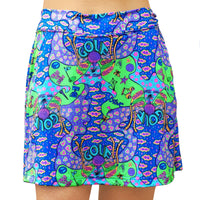 Find your groove on and off the course with our Groovy print. Filled with icons from the 60’s and 70’s along with golf balls, golf clubs, greens, tees and game lingo, the psychedelic color palette will definitely take you back down memory lane! FEATURES Figure flattering straight skirt style, with side slits at hem Modest skirt length & short inseam, both increasing with size Comfortable, no roll waistband Custom milled, lightweight 4-way stretch fabric Attached compression shorts Pockets on each side & one pocket at back of skirt Tug free, no slip grip tape at leg openings Double tee holder Flat seam construction for no fuss wear SIZING NOTE: Skorts get longer as you increase in size. Each size up we increase the length by an inch. . * Coordinating top, zip-hoodie, and bucket hat are sold separately!