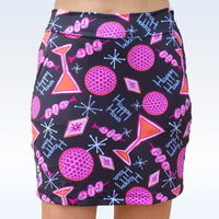 Our mid century inspired Martini Happy Hour print was created with the score 2-FOUR-1 in mind! Featuring a bright orange, pink, black and pale blue color palette with martini glasses, olive picks and golf balls, you’ll fit right in at the 19th hole! FEATURES Figure flattering straight skirt style, with side slits at hem Modest skirt length & short inseam, both increasing with size Comfortable, no roll waistband Custom milled, lightweight 4-way stretch fabric Attached compression shorts Pockets on each side & one pocket at back of skirt Tug free, no slip grip tape at leg openings Double tee holder Flat seam construction for no fuss wear SIZING NOTE: Skorts get longer as you increase in size. Each size up we increase the length by an inch. * Coordinating top, zip-hoodie, and bucket hat are sold separately!