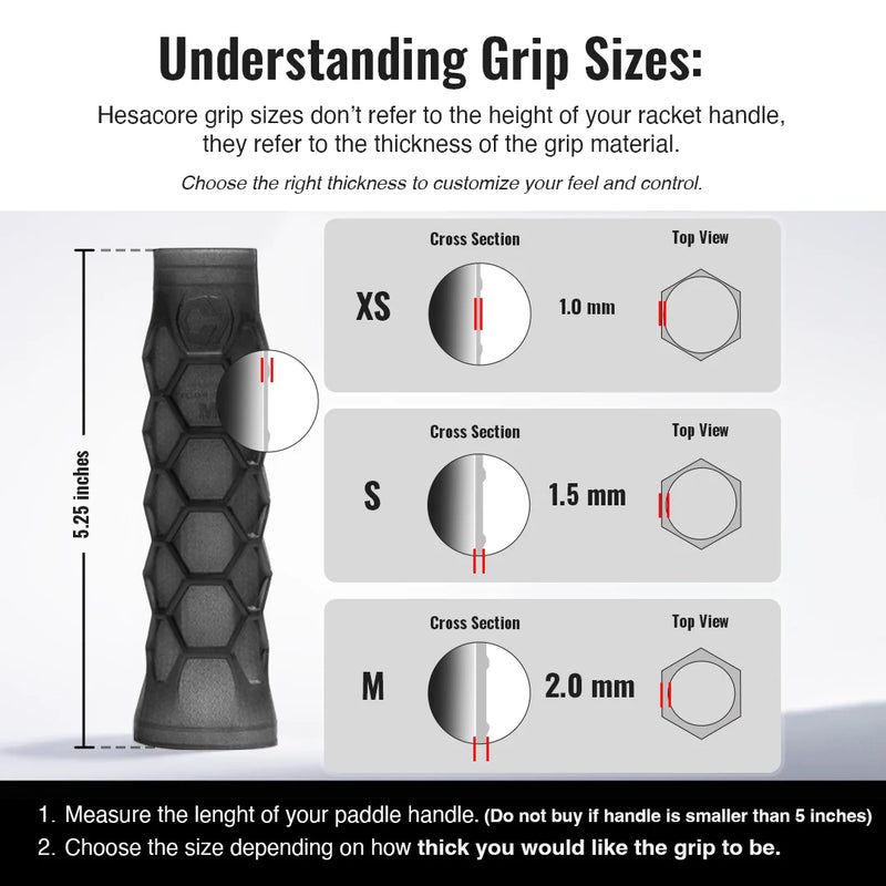 Hesacore Tour Grip Carbon is the new grip designed with carbon filaments that make the handle stiff for any hand, decreasing the “handle” stress. It is also anti-vibration, anti-sweat and anti-humidity. The best way to increase your performance with the greatest possible comfort. Who would have guessed that a honeycomb would prove to be the perfect ergonomic fit for the hand to naturally rest on? Not only that, but the concave hexagons provide a larger friction surface, which reduces the need to tighten the grip and minimizes vibrations from impacts, both traditional causes of injuries. Materials: Silicon Shipping: Calculated shipping for all orders. Our #1 priority is your happiness and satisfaction with Hesacore. Please, contact us pickleball@hesacore.com for technical support, returns and refunds. Size Extra SmallLength: 5 1/4 inchesWeight: 0.49 ounces Size SmallLength: 5 1/4 inchesWeight: 0.53 ounces Size MediumLength: 5 1/4 inchesWeight: 0.62 ounces