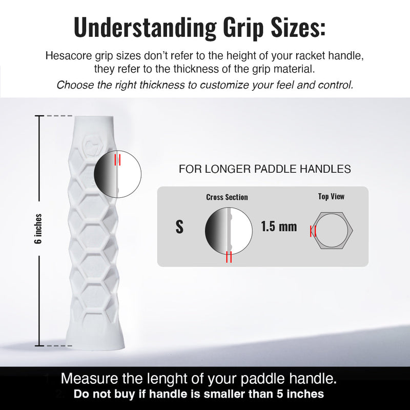 Hesacore Tour Grip offers the perfect balance between comfort and efficiency for club players. It's been designed to absorb sweat, vibrations and to offer a greater friction surface on the grip. Who would have guessed that a honeycomb would prove to be the perfect ergonomic fit for the hand to naturally rest on? Not only that, but the concave hexagons provide a larger friction surface, which reduces the need to tighten the grip and minimizes vibrations from impacts, both traditional causes of injuries. Materials: Silicon Shipping: Calculated shipping for all orders. Our #1 priority is your happiness and satisfaction with Hesacore. Please, contact us pickleball@hesacore.com for technical support, returns and refunds. Size SmallLength: 6 inchesWeight: 0.58 ounces FIND OUT YOUR SIZE