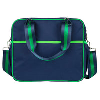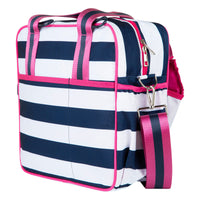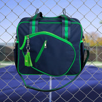 Experience the epitome of style, functionality, and durability with the Queen of the Court Prepster Pickleball Bag. Crafted from premium Oxford fabric, this bag is designed to elevate your pickleball game while ensuring your gear stays organized and secure. DESIGNED IN USA: Our ladies pickleball bags designed for the serious pickle ball woman to protect your pickle ball paddles and gear. Designed by established boutique pickleball brand Queen of the Court. Level up your pickleball accessory style with our beautiful bag, includes striped shoulder strap that can be used as a crossbody pickleball bag or a shoulder bag pickle ball tote. Stylish upgrade to any pickleball backpack or pickleball sling bag. Makes a great pickleball gift. HIGH QUALITY, LIGHTWEIGHT, STURDY, LARGE: Holds all of your pickleball gear and pickle ball accessories in a high fashion pickle ball tote. Room for your court shoes, sweatshirt, pickleball towel and water bottles. Large enough to hold your pickleball set of 2-3 paddles and balls, pickle balls. Large zip opening for maximum access. Easy care with soft cloth, water and mild detergent. This is the ultimate pickleball duffle. 15"x 13"x 5". PADDLE COVER FRONT ZIP POCKET: Keep your 2-3 pickleball paddles safely on the outside with attached pickle ball paddle cover. High quality padded paddle cover pocket gives maximum protection for your pickleball paddles. Large enough to fit all sizes of paddles. No more pickle ball rackets floating around a tennis bag. BUILT IN FENCE HOOK DESIGNED BY QUEEN OF THE COURT: Hang your pickle ball paddle tote anywhere! Easily attach your pickle ball tote to any fence with our caribeaner system to protect it from the ground and allow you to have easy access to all of your pickleball paddles, pickle-ball equipment, pickle ball balls. CONVENIENT ORGANIZATION: Two (2) exterior water bottle pockets or pickle ball pockets, two (2) large exterior back slip pockets, four (4) interior pockets including large zip mesh pocket, one (1) front zip pocket for phone/keys. Water resistant. Easy care. Elevate your pickleball experience with the Queen of the Court Prepster Pickleball Bag – a stylish and functional companion on and off the court.