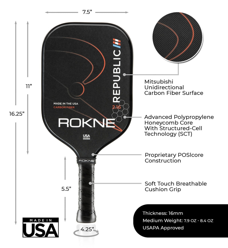 A true American classic, the ROKNE Republic 2.16 unidirectional carbon fiber pickleball paddle captures the essence of domestic craftmanship with a unique blend of premium materials and proprietary engineering to create unprecedented precision, control and consistency. MITSUBISHI UNIDIRECTIONAL CARBON FIBER Fabricated by Mitsubishi the unidirectional carbon fiber provides the ultimate surface consistency to ensure that your ball striking remains true and pure, point after point, game after game, match after match. STRUCTURED-CELL TECHNOLOGY (SCT) The advanced polypropylene core with Structured-Cell Technology (SCT) guarantees that each honeycomb cell has a consistent shape and size to create a large yet stable and responsive sweet spot. POSIcore CONSTRUCTION The paddle's proprietary POSIcore Construction creates the most solid and durable feel of any paddle on the market.
