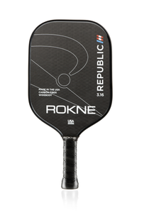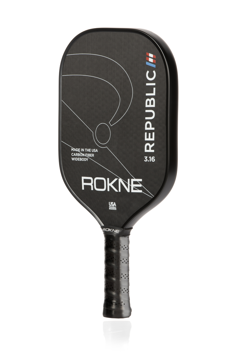 A true American classic, the ROKNE Republic 3.16 raw carbon fiber pickleball paddle captures the essence of domestic craftmanship with a unique blend of premium materials and proprietary engineering to generate the ultimate combination of power, control and spin. MITSUBISHI RAW CARBON FIBER Fabricated by Mitsubishi with a pure resin application the raw carbon fiber surface resists degradation and provides unprecedented amounts of spin for exquisite and consistent shot-making. STRUCTURED-CELL TECHNOLOGY (SCT) The advanced polypropylene core with Structured-Cell Technology (SCT) guarantees that each honeycomb cell has a consistent shape and size to create a large yet stable and responsive sweet spot. POSIcore CONSTRUCTION The paddle's proprietary POSIcore Construction creates the most solid and durable feel of any paddle on the market.