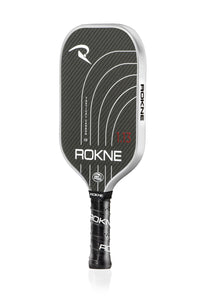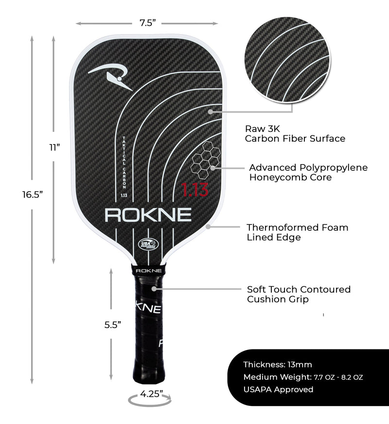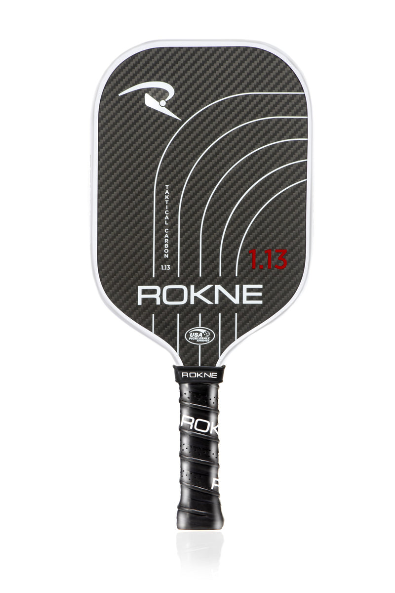 The ROKNE Taktical Carbon 1.13 pickleball paddle is a 13MM medium weighted paddle constructed with 3K raw carbon fiber and a thermoformed foam lined edge for durability, balance and consistency. 3K RAW CARBON FIBER SURFACE The Toray T700 3K raw carbon fiber textured surface creates extreme friction for an enhanced spin rate and exquisite shot-making. THERMOFORMED FOAM LINED EDGE The thermoformed foam lined edge creates a stable and balanced sweet spot that provides a remarkably consistent feel. ALL DAY COMFORT Play longer with the premium soft touch contoured cushion handle and breathable grip.
