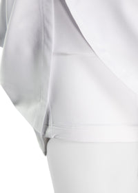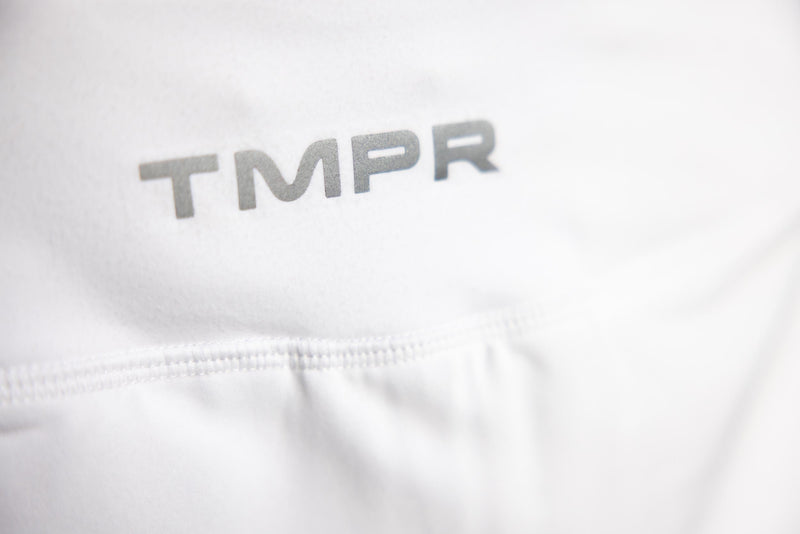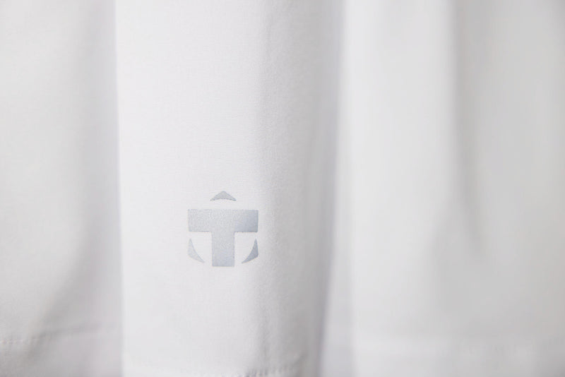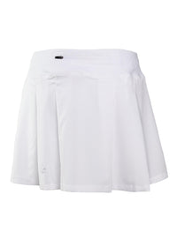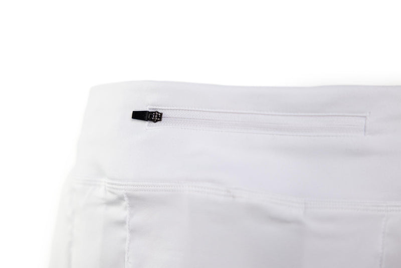 This comfortable, tasteful *white women's performance skort weighs 4 oz. with a 75% nylon, 25% spandex blend. Its convenient rear zip pocket as well as under-skirt stretch pockets for balls add a level of practicality. Look, feel and perform your best on the courts with the TMPR performance skort.