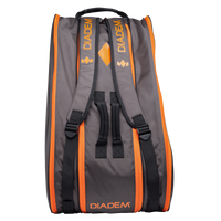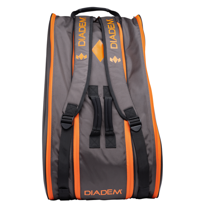 The Diadem Tour v3 12PK is an extremely versatile racket bag. This racket bag can hold up to twelve rackets across its two main compartments and the adjustable and padded shoulder straps add plenty of comfort for travel. We built the straps to be able to tighten and fit even the youngest and smallest of players. The Diadem Tour v3 12K is made of high-quality material that is durable and designed to match the Elevate and Nova racket series' cosmetics. The two exterior accessory compartments keep extra gear tidy while the separate shoe compartment and water bottle ad to the overall organization of this racket bag. Overall, the Diadem Tour v3 12PK is a durable, sleek and efficient racket bag that lets players travel efficiently with enough gear for long training sessions, grueling league matches and competitive tournaments. 3 Main Compartments - Holds up to 12 rackets. 2 Easily padded and adjustable shoulder straps. Padded grab handles. Water bottle pocket. Separate shoe compartment with easy access. Thermally insulated pockets. Color: Navy, Black, Grey, and Gun Metal Dimensions: L 30” x W 18” x H 14”