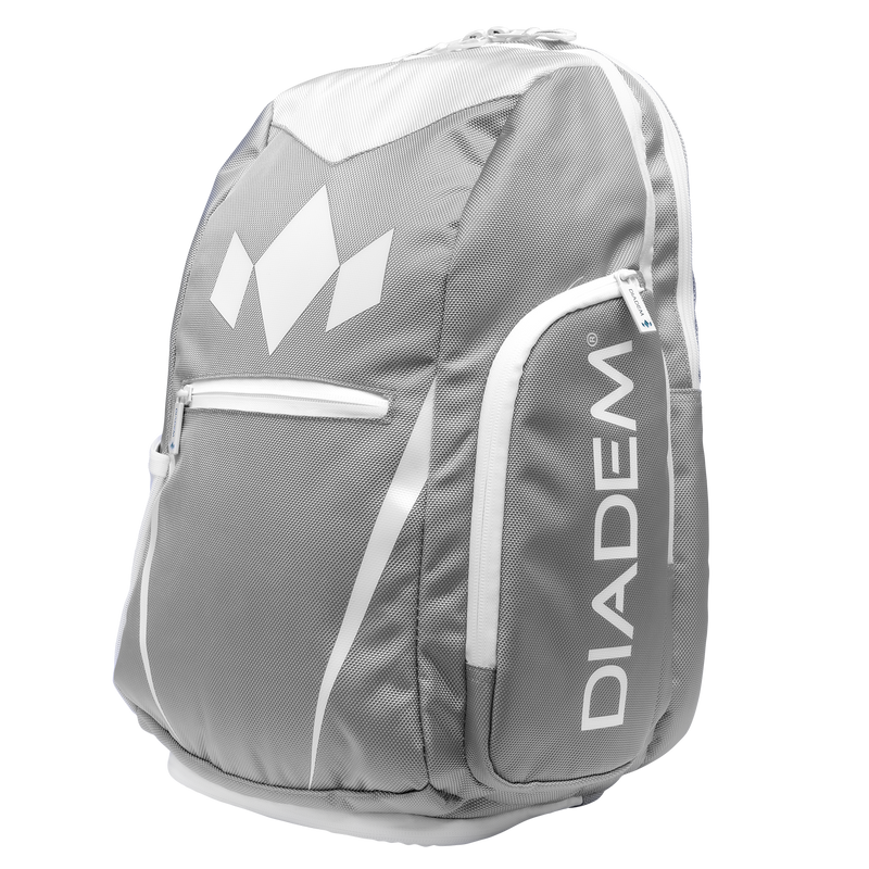 The Diadem Tour v3 Backpack is an extremely versatile bag. With updated cosmetics, this backpack can hold up to three tennis rackets or 3 pickleball paddles and all your extra gear for a day on court. The two main compartments have multiple interior pockets separated by neoprene for easy and efficient organization. The exterior pockets can hold a number of other essentials for the courts and an external shoe compartment underneath the bag is perfect for tennis shoes or sweaty clothes. The Diadem Tour Backpack is a must for any tennis and pickleball players looking to travel light and efficiently without compromising on the most essential gear. Holds up to 3 tennis rackets or pickleball paddles 2 Main Compartments with dividers Multiple external accessories pockets 2 Padded and adjustable backpack straps Padded grab handles Water bottle pocket Separate shoe compartment with easy access Comes in Grey, Black, Pink, Blue, and Gun Metal Dimensions: H 18" x W 13" x D 8"