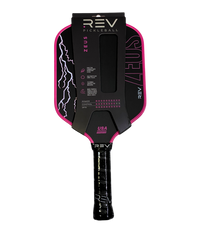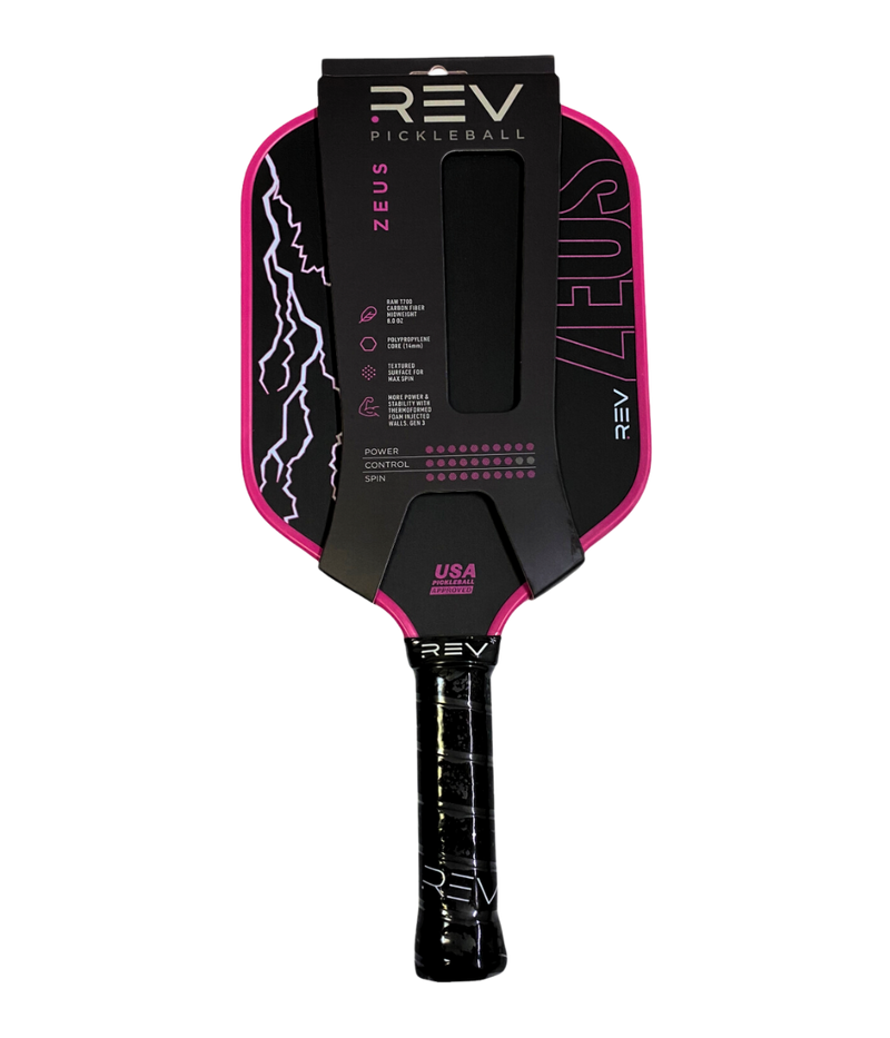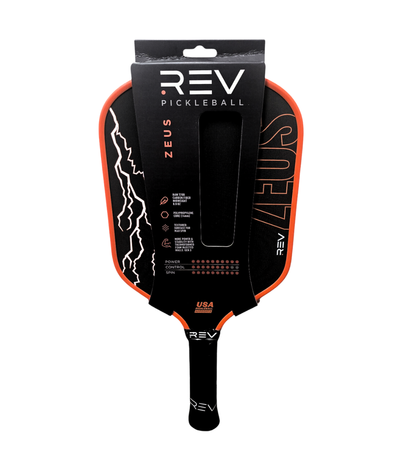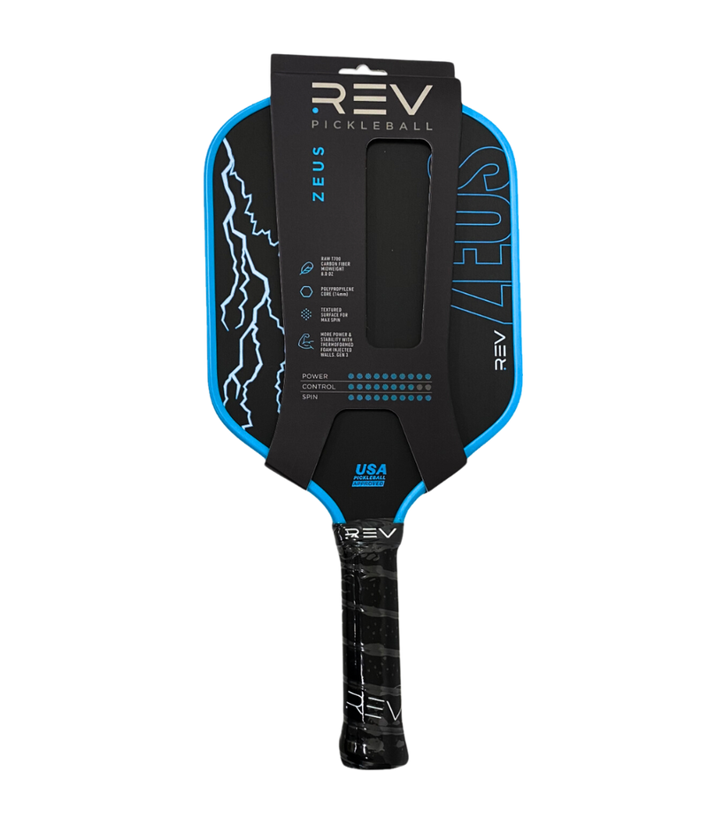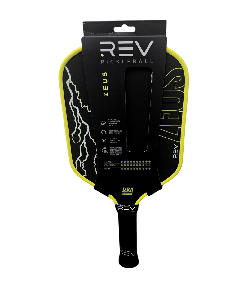 Unleash your inner champion with the Zeus Paddle, engineered for players who demand power, precision, and playability. With advanced technology and a design focused on performance, the Zeus Paddle is perfect for players of all levels who want to dominate the court. Key Features & Why They Matter T700 Raw Carbon Fiber Face: This premium material creates unmatched precision, touch, and spin. Whether you're hitting powerful smashes or soft dinks, this paddle ensures every shot is controlled and accurate. Thermoformed Construction with Gen 3 Technology: Built for durability and stability, the thermoformed design includes foam-injected walls that reduce vibrations, making each hit feel smooth and comfortable while enhancing power. 14mm Polypropylene Core: The core provides excellent durability, responsiveness, and a balanced feel, making it easy to control your shots while maintaining power. Hybrid Shape: A larger sweet spot means more consistent hits and fewer mishits, giving you confidence in every swing. Optimal Dimensions: At 8.0 oz, this paddle balances power and maneuverability, so you can react quickly while delivering strong, effective shots. Specifications Paddle Dimensions: 16.25" x 7.75" Face Material: T700 Raw Carbon Fiber Core Thickness: 14mm polypropylene honeycomb core Handle Length: 5.25" Grip Circumference: 4.2" Weight: Approximately 8.0 oz Special Features: Thermoformed construction, foam-injected walls, hybrid shape, Gen 3 technology Why Choose the Zeus Paddle? The Zeus Paddle is Rev’s most powerful paddle yet. Designed to maximize precision, spin, and power, it is the ideal choice for players who want to dominate on the court. Its hybrid shape and advanced construction make it versatile, consistent, and durable—perfect for competitive play or just leveling up your game. How is the Zeus Different from Other Rev Paddles? Compared to the Platinum Paddle: While the Platinum focuses on speed and control with its aerodynamic throat hole and edgeless design, the Zeus is all about delivering raw power with precision. Compared to the Aria or Aria Pro: The Zeus has a thicker core and more advanced carbon fiber face, making it ideal for players who prioritize spin, durability, and overall performance. Purpose-Built for Champions Whether you're a beginner aiming for consistency or a seasoned player seeking an edge, the Zeus Paddle combines cutting-edge technology with a player-focused design to bring out your best performance on the court.